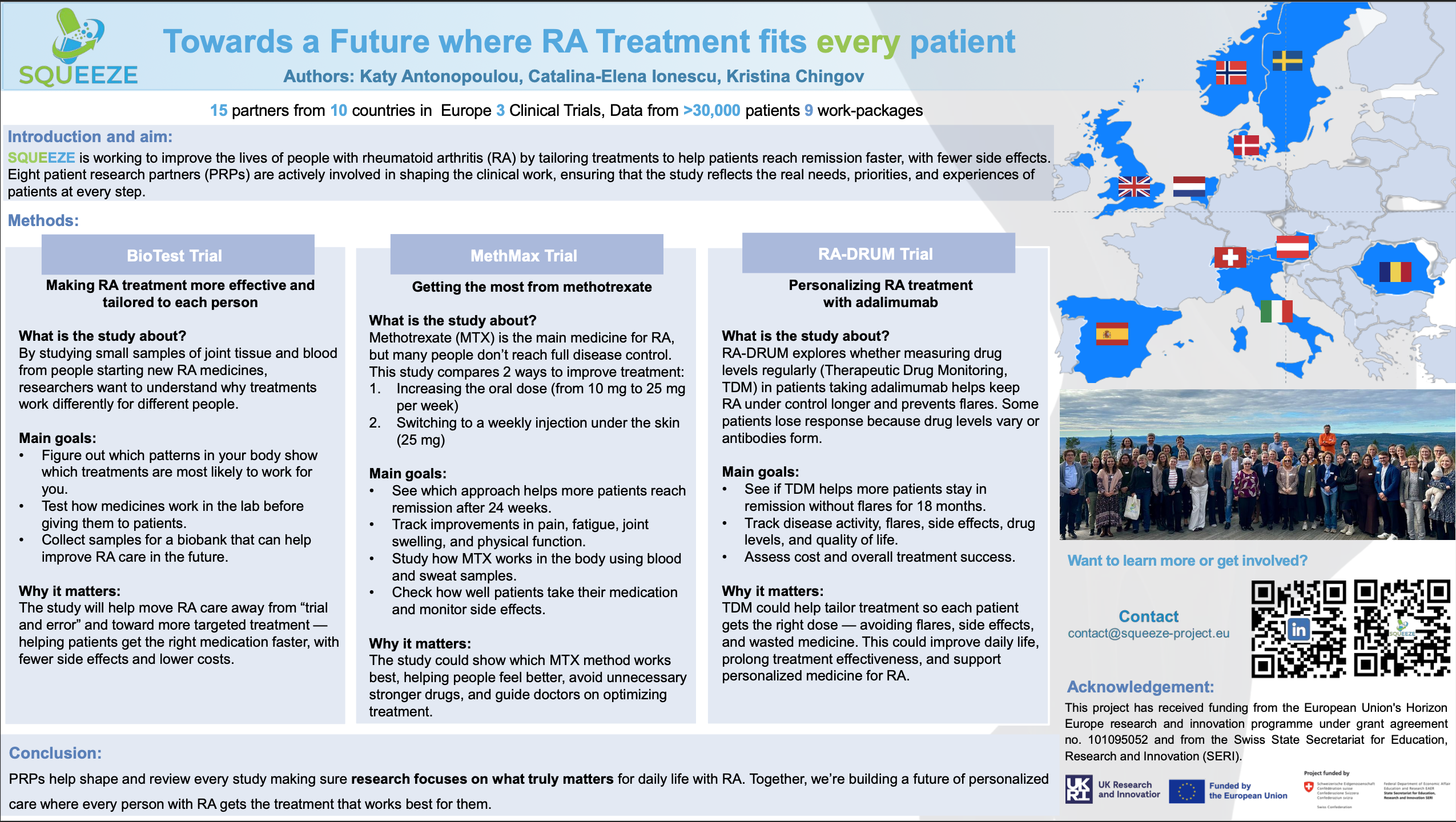 At the 2025 edition of the conference, SQUEEZE contributed an updated project poster highlighting recent scientific progress, ongoing clinical trials, and key developments across the work packages. The poster was included in the Best Practice Fair poster collection on the PARE conference website, ensuring visibility to more than 120 conference participants. Although it was not selected for oral presentation, the poster provided an important opportunity to communicate the project’s scope, ambition, and patient-centred approach to a highly relevant audience.
